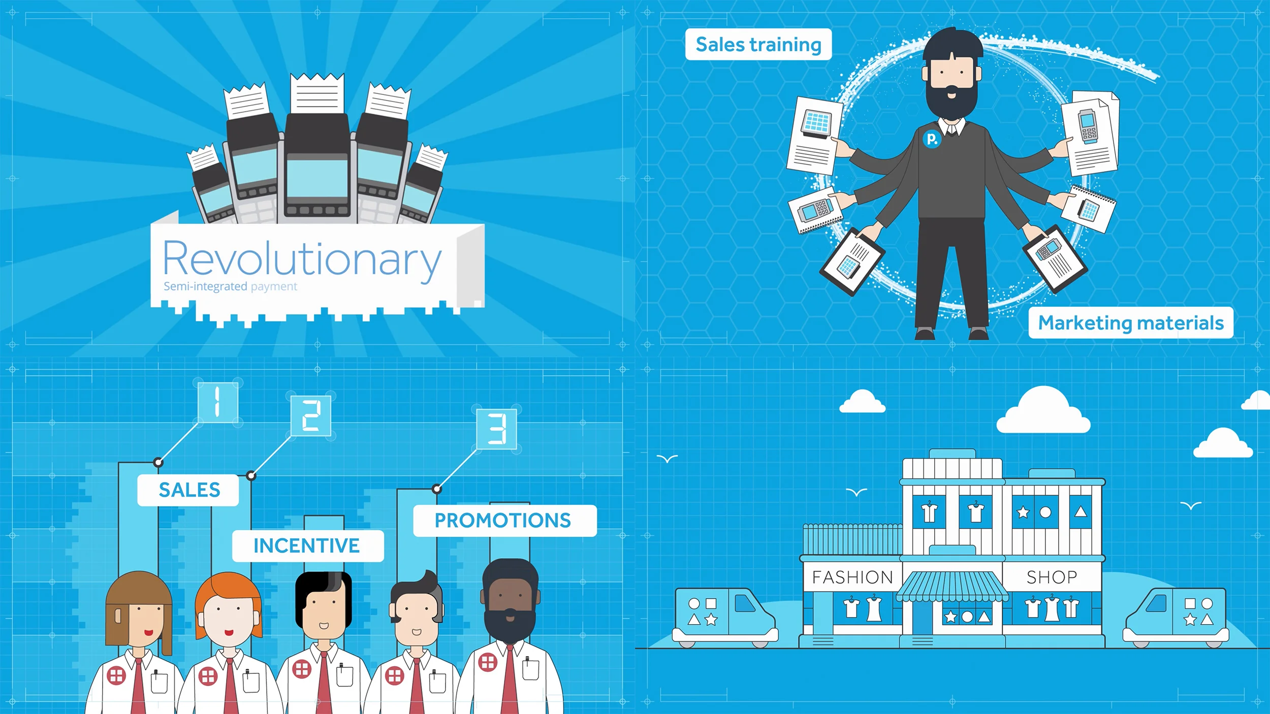 For a card payment company, I art directed and produced a range of explainer videos. We developed a clean house style, focussing on clear communication of their products and services.
